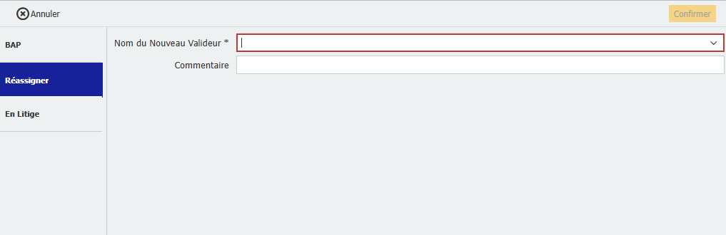 Pour valider une tâche, une fois une tâche sélectionné les choix apparaissent, ici trois choix, BAP - Réassigner - En Litige, une fois que vous avez sélectionné le choix et rempli les champs obligatoires, vous pouvez "Confirmer" la tâche.